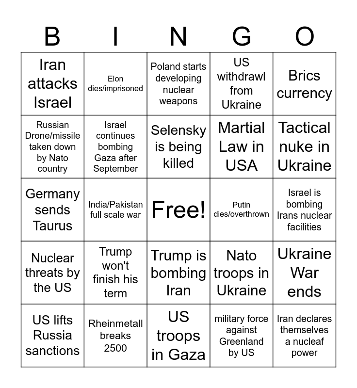 This bingo card has a free space and 24 words: Trump won't finish his term, Rheinmetall breaks 2500, Selensky is being killed, US lifts Russia sanctions, Brics currency, Iran attacks Israel, Russian Drone/missile taken down by Nato country, Elon dies/imprisoned, Putin dies/overthrown, Trump is bombing Iran, Martial Law in USA, Germany sends Taurus, Nato troops in Ukraine, Ukraine War ends, Israel continues bombing Gaza after September, military force against Greenland by US, Israel is bombing Irans nuclear facilities, Poland starts developing nuclear weapons, Tactical nuke in Ukraine, India/Pakistan full scale war, Iran declares themselves a nucleaf power, Nuclear threats by the US, US withdrawl from Ukraine and US troops in Gaza.
