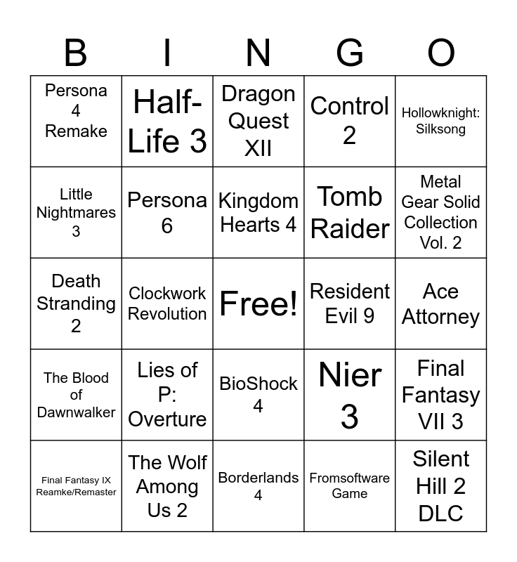 This bingo card has a free space and 24 words: Lies of P: Overture, The Wolf Among Us 2, Kingdom Hearts 4, Final Fantasy IX Reamke/Remaster, Hollowknight: Silksong, Persona 4 Remake, Little Nightmares 3, Half-Life 3, Resident Evil 9, BioShock 4, Tomb Raider, Death Stranding 2, Nier 3, Final Fantasy VII 3, Persona 6, Fromsoftware Game, Ace Attorney, Dragon Quest XII, Metal Gear Solid Collection Vol. 2, Clockwork Revolution, Silent Hill 2 DLC, The Blood of Dawnwalker, Control 2 and Borderlands 4.