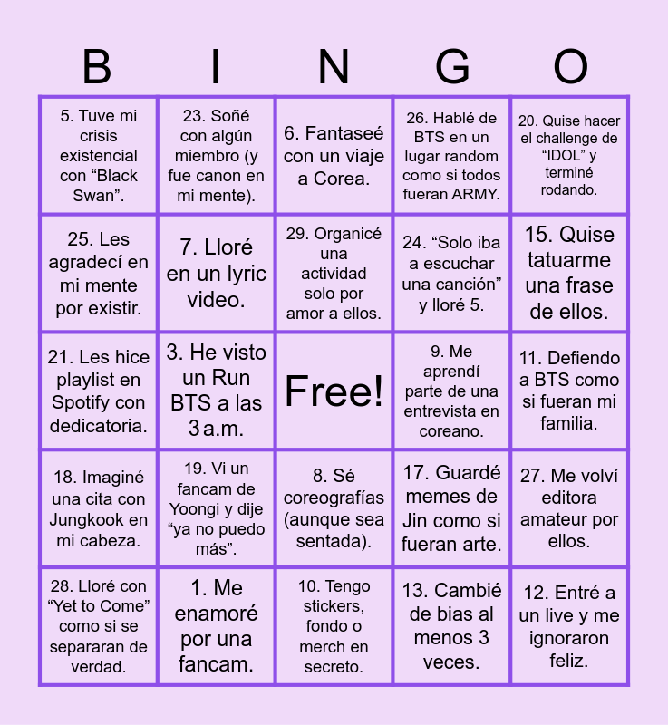 This bingo card has a free space and 30 words: 1. Me enamoré por una fancam., 2. Dije “solo los admiro” y ahora lloro por ellos., 3. He visto un Run BTS a las 3 a.m., 4. Sufrí con el enlistamiento de mi bias., 5. Tuve mi crisis existencial con “Black Swan”., 6. Fantaseé con un viaje a Corea., 7. Lloré en un lyric video., 8. Sé coreografías (aunque sea sentada)., 9. Me aprendí parte de una entrevista en coreano., 10. Tengo stickers, fondo o merch en secreto., 11. Defiendo a BTS como si fueran mi familia., 12. Entré a un live y me ignoraron feliz., 13. Cambié de bias al menos 3 veces., 14. “Solo veré un video” y fueron 3 horas., 15. Quise tatuarme una frase de ellos., 16. Subí algo de ellos en modo anónimo., 17. Guardé memes de Jin como si fueran arte., 18. Imaginé una cita con Jungkook en mi cabeza., 19. Vi un fancam de Yoongi y dije “ya no puedo más”., 20. Quise hacer el challenge de “IDOL” y terminé rodando., 21. Les hice playlist en Spotify con dedicatoria., 22. Tengo un álbum favorito aunque me cueste admitirlo., 23. Soñé con algún miembro (y fue canon en mi mente)., 24. “Solo iba a escuchar una canción” y lloré 5., 25. Les agradecí en mi mente por existir., 26. Hablé de BTS en un lugar random como si todos fueran ARMY., 27. Me volví editora amateur por ellos., 28. Lloré con “Yet to Come” como si se separaran de verdad., 29. Organicé una actividad solo por amor a ellos. and 30. Guardé la fecha de debut/aniversario en mi calendario..