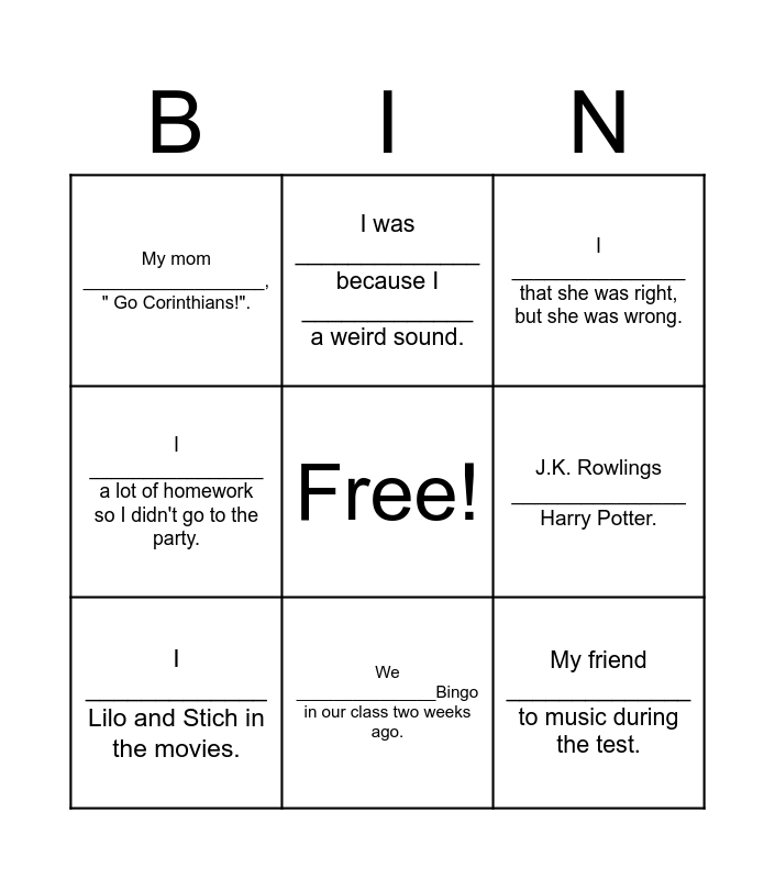 This bingo card has a free space and 13 words: I _________ a new car last year., We ___________ to the mall to buy new shoes., I _____________ Lilo and Stich in the movies., I was ______________ because I _____________ a weird sound., I ________________ a lot of homework so I didn't go to the party., My friend ______________ to music during the test., The girl ________________ a beautiful dress for her birthday party., My English teacher ______________ his back when he fell., We _______________Bingo in our class two weeks ago., My mom __________________, " Go Corinthians!"., J.K. Rowlings _______________ Harry Potter., I ________________ that she was right, but she was wrong. and My friend _______________ me a video of a dog laughing..