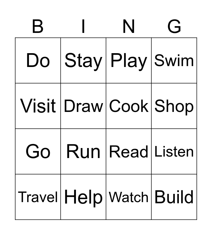 This bingo card has 16 words: Help, Listen, Play, Do, Go, Stay, Read, Watch, Visit, Draw, Travel, Swim, Run, Shop, Cook and Build.