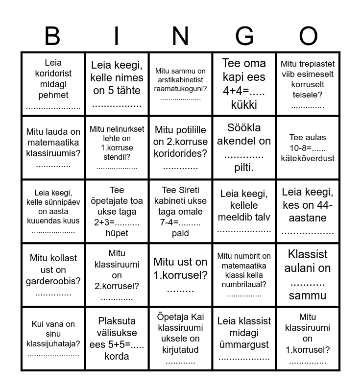 This bingo card has 25 words: Mitu klassiruumi on 2.korrusel? ............., Õpetaja Kai klassiruumi uksele on kirjutatud ............, Mitu potilille on 2.korruse koridorides? ............., Kui vana on sinu klassijuhataja? ......................., Mitu trepiastet viib esimeselt korruselt teisele? .............., Leia koridorist midagi pehmet ......................, Mitu lauda on matemaatika klassiruumis? .............., Leia keegi, kelle nimes on 5 tähte ................., Leia keegi, kellele meeldib talv ...................., Mitu ust on 1.korrusel? ........., Söökla akendel on ............. pilti., Leia keegi, kelle sünnipäev on aasta kuuendas kuus ...................., Mitu numbrit on matemaatika klassi kella numbrilaual? ................, Klassist aulani on ........... sammu, Mitu nelinurkset lehte on 1.korruse stendil? ..................., Mitu klassiruumi on 1.korrusel? ..............., Leia keegi, kes on 44-aastane .................., Mitu sammu on arstikabinetist raamatukoguni? ...................., Tee aulas 10-8=...... kätekõverdust, Tee õpetajate toa ukse taga 2+3=.......... hüpet, Tee Sireti kabineti ukse taga omale 7-4=......... paid, Plaksuta välisukse ees 5+5=..... korda, Mitu kollast ust on garderoobis? .............., Tee oma kapi ees 4+4=..... kükki and Leia klassist midagi ümmargust ....................