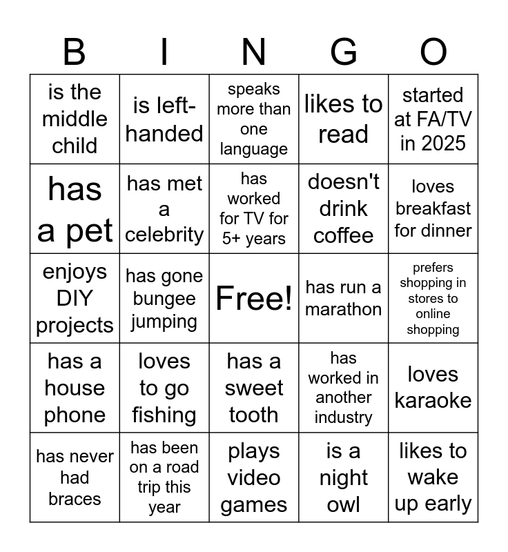 This bingo card has a free space and 50 words: has worked at FA for 10+ years, likes to wake up early, has more than 1 tattoo, plays video games, loves to go fishing, was in marching band in high school, is left-handed, has lived in another country, has a pet, has a garden, has met a celebrity, likes to read, loves karaoke, has worked in another industry, doesn't use social media, has lived in 3+ states, has worked for TV for 5+ years, has run a marathon, has gone sky-diving, started at FA/TV in 2025, has gone bungee jumping, is a night owl, is the middle child, doesn't drink coffee, is the oldest child, is an only child, loves breakfast for dinner, dreams in black and white, speaks more than one language, has a sweet tooth, can juggle, can solve a Rubik's cube, plays a musical instrument, has 1 or more children, has been on a road trip this year, has an upcoming vacation planned, has been on a cruise, is afraid of heights, has never broken a bone, prefers shopping in stores to online shopping, has a birthday this month, enjoys true crime, loves spicy food, likes to dance, has never had braces, enjoys DIY projects, has a side hustle, has a food allergy, has a house phone and has had stitches.