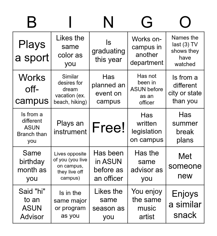 This bingo card has a free space and 24 words: Lives opposite of you (you live on campus, they live off campus), Is in the same major or program as you, Has planned an event on campus, Said "hi" to an ASUN Advisor, Names the last (3) TV shows they have watched, Plays a sport, Works off-campus, Likes the same color as you, Has written legislation on campus, Has been in ASUN before as an officer, Has not been in ASUN before as an officer, Is from a different ASUN Branch than you, Has the same advisor as you, Met someone new, Similar desires for dream vacation (ex. beach, hiking), You enjoy the same music artist, Has summer break plans, Is graduating this year, Is from a different city or state than you, Plays an instrument, Enjoys a similar snack, Same birthday month as you, Works on-campus in another department and Likes the same season as you.
