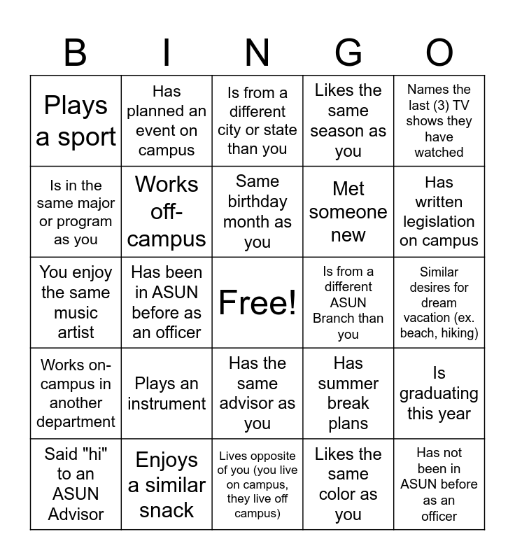 This bingo card has a free space and 24 words: Plays an instrument, Enjoys a similar snack, Same birthday month as you, Said "hi" to an ASUN Advisor, Names the last (3) TV shows they have watched, Plays a sport, Is in the same major or program as you, Has planned an event on campus, Is from a different ASUN Branch than you, Has the same advisor as you, Met someone new, You enjoy the same music artist, Has summer break plans, Is graduating this year, Works off-campus, Likes the same color as you, Similar desires for dream vacation (ex. beach, hiking), Is from a different city or state than you, Has written legislation on campus, Has been in ASUN before as an officer, Has not been in ASUN before as an officer, Works on-campus in another department, Likes the same season as you and Lives opposite of you (you live on campus, they live off campus).