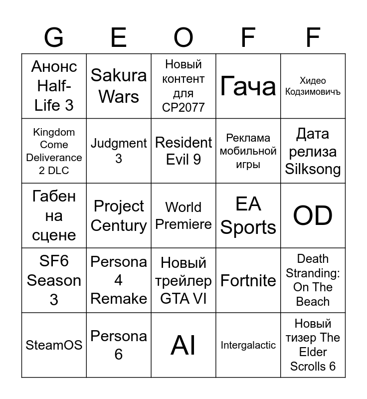 This bingo card has a free space and 24 words: SteamOS, Persona 4 Remake, Resident Evil 9, Intergalactic, Хидео Кодзимовичъ, Анонс Half-Life 3, Sakura Wars, Новый контент для CP2077, EA Sports, OD, Габен на сцене, Judgment 3, Fortnite, Death Stranding: On The Beach, Kingdom Come Deliverance 2 DLC, Persona 6, AI, Гача, Дата релиза Silksong, SF6 Season 3, Project Century, Новый трейлер GTA VI, Реклама мобильной игры and Новый тизер The Elder Scrolls 6.