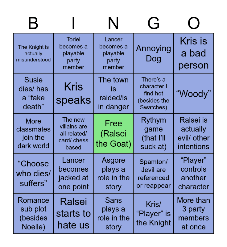 This bingo card has a free space and 24 words: Lancer becomes jacked at one point, Ralsei starts to hate us, The town is raided/is in danger, Romance sub plot (besides Noelle), Kris is a bad person, The Knight is actually misunderstood, Susie dies/ has a “fake death”, Toriel becomes a playable party member, Rythym game (that I’ll suck at), Asgore plays a role in the story, There’s a character I find hot (besides the Swatches), More classmates join the dark world, Spamton/ Jevil are referenced or reappear, “Player” controls another character, Kris speaks, Kris/ “Player” is the Knight, Ralsei is actually evil/ other intentions, Lancer becomes a playable party member, “Woody”, The new villains are all related/ card/ chess based, More than 3 party members at once, “Choose who dies/ suffers”, Annoying Dog and Sans plays a role in the story.