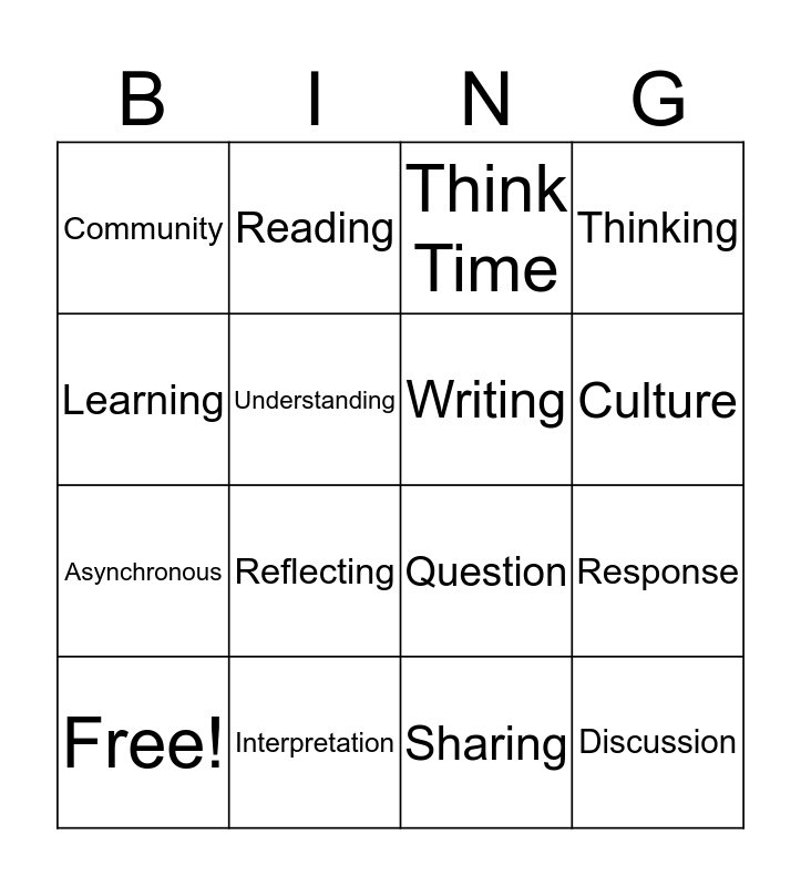 This bingo card has a free space and 15 words: Free!, Discussion, Think Time, Community, Culture, Learning, Reflecting, Sharing, Understanding, Asynchronous, Response, Thinking, Writing, Reading and Interpretation.