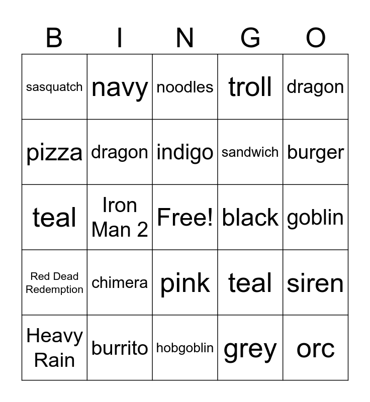 This bingo card has a free space and 24 words: chimera, burrito, indigo, Heavy Rain, dragon, sasquatch, pizza, navy, black, pink, sandwich, teal, teal, siren, dragon, grey, goblin, noodles, burger, Iron Man 2, orc, Red Dead Redemption, troll and hobgoblin.