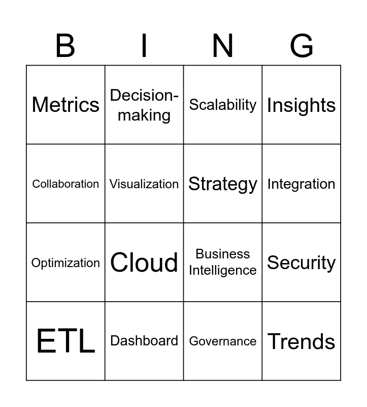 This bingo card has 31 words: Free!, Analytics, Dashboard, Data, Insights, Metrics, Visualization, KPI, Trends, Reporting, Big Data, Business Intelligence, Predictive, Real-time, Cloud, AI, Machine Learning, ETL, Data Warehouse, Governance, Integration, Self-service, Automation, Scalability, Security, Collaboration, Decision-making, Strategy, Performance, Optimization and Innovation.