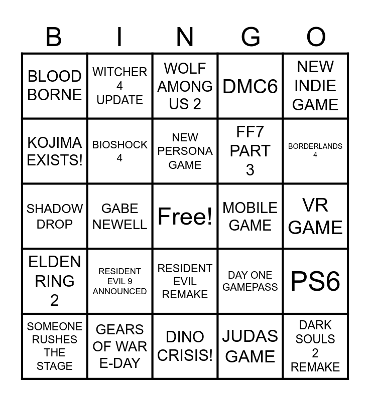 This bingo card has a free space and 24 words: RESIDENT EVIL 9 ANNOUNCED, GEARS OF WAR E-DAY, NEW PERSONA GAME, SOMEONE RUSHES THE STAGE, NEW INDIE GAME, BLOOD BORNE, KOJIMA EXISTS!, WITCHER 4 UPDATE, MOBILE GAME, RESIDENT EVIL REMAKE, FF7 PART 3, SHADOW DROP, DAY ONE GAMEPASS, PS6, BIOSHOCK 4, JUDAS GAME, VR GAME, WOLF AMONG US 2, BORDERLANDS 4, GABE NEWELL, DARK SOULS 2 REMAKE, ELDEN RING 2, DMC6 and DINO CRISIS!.