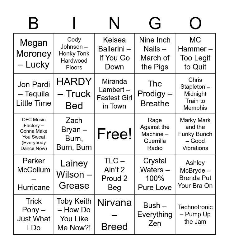 This bingo card has a free space and 50 words: Morgan Wallen – Up Down, Technotronic – Pump Up the Jam, Zach Top – Cold Beer & Country Music, Nirvana – Breed, Lainey Wilson – Grease, Salt-N-Pepa – Push It, Cody Johnson – Honky Tonk Hardwood Floors, Metallica – Fuel, Jon Pardi – Tequila Little Time, Coolio – 1, 2, 3, 4 (Sumpin’ New), HARDY – Truck Bed, Nine Inch Nails – March of the Pigs, Ashley McBryde – Brenda Put Your Bra On, Crystal Waters – 100% Pure Love, Tyler Childers – Country Squire, Beastie Boys – Intergalactic, Miranda Lambert – Fastest Girl in Town, Rage Against the Machine – Guerrilla Radio, Luke Combs – Beer Never Broke My Heart, MC Hammer – Too Legit to Quit, Zach Bryan – Burn, Burn, Burn, Bush – Everything Zen, Megan Moroney – Lucky, The Prodigy – Breathe, Travis Tritt – T-R-O-U-B-L-E, House of Pain – Jump Around, Chris Stapleton – Midnight Train to Memphis, Soundgarden – Rusty Cage, Kelsea Ballerini – If You Go Down, TLC – Ain’t 2 Proud 2 Beg, Ernest – Did It With You, Da Brat – Give It 2 You, Kameron Marlowe – Burn ‘Em All, Alanis Morissette – Right Through You, Toby Keith – How Do You Like Me Now?!, 2Pac – Can’t C Me, Randall King – Takin’ It As It Comes, Faith No More – We Care a Lot, Hailey Whitters – Everything She Ain’t, Marky Mark and the Funky Bunch – Good Vibrations, Reba McEntire – Why Haven’t I Heard From You, Smashing Pumpkins – Zero, Clint Black – Summer’s Comin’, Dr. Dre – Let Me Ride, Trick Pony – Just What I Do, C+C Music Factory – Gonna Make You Sweat (Everybody Dance Now), Joe Diffie – Pickup Man, No Doubt – Spiderwebs, Parker McCollum – Hurricane and Notorious B.I.G. – Going Back to Cali.
