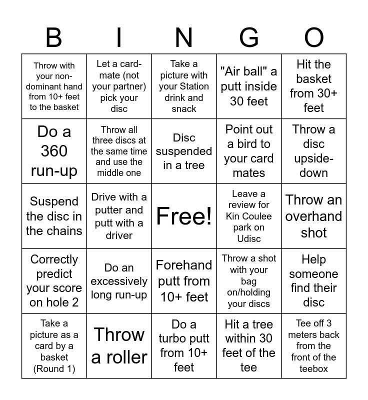This bingo card has a free space and 26 words: Forehand putt from 10+ feet, Hit a tree within 30 feet of the tee, Disc suspended in a tree, Throw a roller, Hit the basket from 30+ feet, Throw with your non-dominant hand from 10+ feet to the basket, Do a 360 run-up, Let a card-mate (not your partner) pick your disc, Throw an overhand shot, Throw a shot with your bag on/holding your discs, Point out a bird to your card mates, Suspend the disc in the chains, Help someone find their disc, Take a picture as a card by a basket (Round 1), Drive with a putter and putt with a driver, Throw a "worm burner", "Air ball" a putt inside 30 feet, Correctly predict your score on hole 2, Take a picture with your Station drink and snack, Tee off 3 meters back from the front of the teebox, Throw a disc upside-down, Do a turbo putt from 10+ feet, Leave a review for Kin Coulee park on Udisc, Do an excessively long run-up, Throw all three discs at the same time and use the middle one and Announce your partner's throw like a golf announcer as they throw.