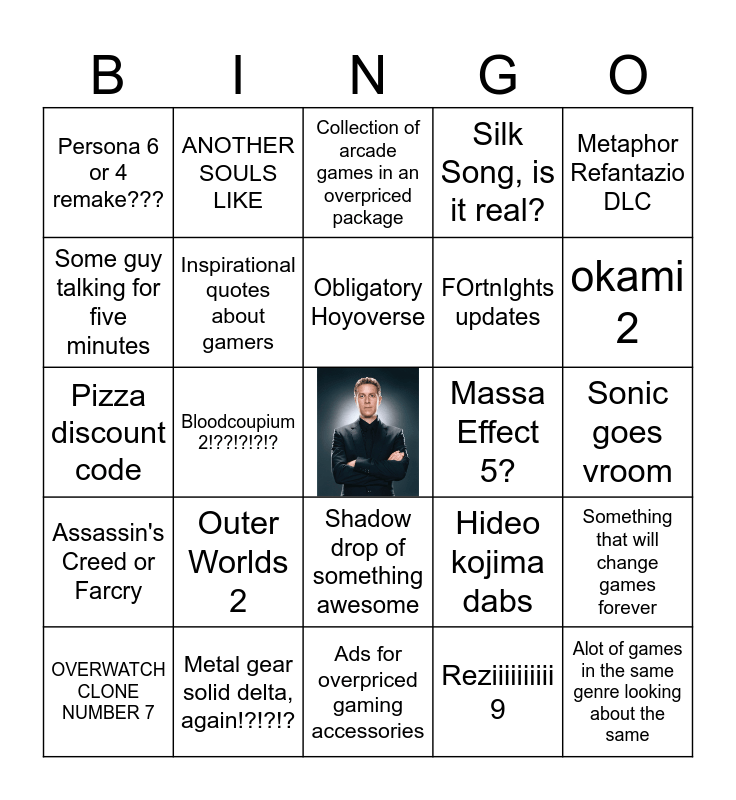This bingo card has a free space and 24 words: Outer Worlds 2, Metal gear solid delta, again!?!?!?, Obligatory Hoyoverse, OVERWATCH CLONE NUMBER 7, Metaphor Refantazio DLC, Persona 6 or 4 remake???, Some guy talking for five minutes, ANOTHER SOULS LIKE, Massa Effect 5?, Shadow drop of something awesome, FOrtnIghts updates, Pizza discount code, Hideo kojima dabs, Something that will change games forever, Inspirational quotes about gamers, Reziiiiiiiiii 9, Sonic goes vroom, Collection of arcade games in an overpriced package, okami 2, Bloodcoupium 2!??!?!?!?, Alot of games in the same genre looking about the same, Assassin's Creed or Farcry, Silk Song, is it real? and Ads for overpriced gaming accessories.