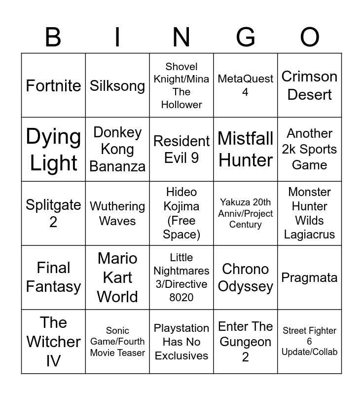 This bingo card has a free space and 29 words: The Witcher IV, Cyberpunk, Wuthering Waves, Five Nights At Freddy's 2 Movie Trailer, Fortnite, Shovel Knight/Mina The Hollower, Donkey Kong Bananza, Mario Kart World, Yakuza 20th Anniv/Project Century, Sonic Game/Fourth Movie Teaser, Monster Hunter Wilds Lagiacrus, Street Fighter 6 Update/Collab, Playstation Has No Exclusives, Enter The Gungeon 2, Another 2k Sports Game, Phasmophobia Movie, Little Nightmares 3/Directive 8020, Final Fantasy, Crimson Desert, Splitgate 2, Chrono Odyssey, The Finals, Mistfall Hunter, Dying Light, MetaQuest 4, Silksong, Pragmata, Resident Evil 9 and Capcom Sweep.