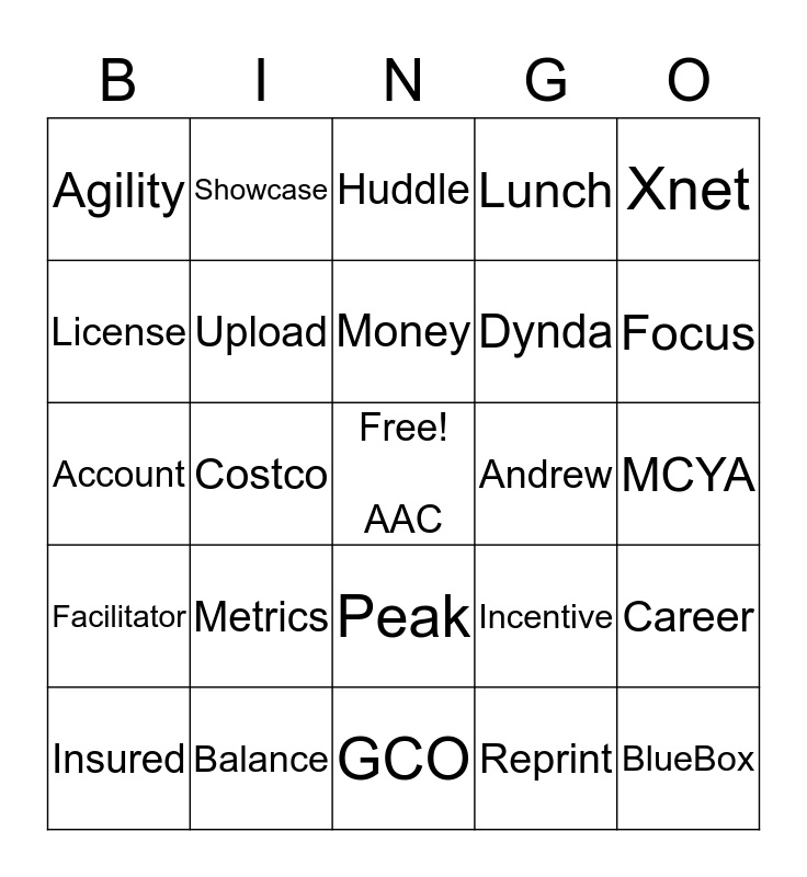 This bingo card has a free space and 24 words: Metrics, Balance, Money, Insured, Xnet, Agility, License, Showcase, Andrew, Peak, Dynda, Account, Incentive, Career, Upload, Reprint, MCYA, Huddle, Focus, Costco, BlueBox, Facilitator, Lunch and GCO.