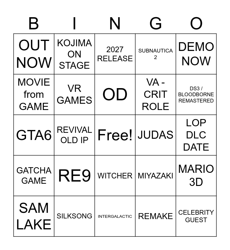 This bingo card has a free space and 24 words: RE9, SILKSONG, OD, SAM LAKE, DEMO NOW, OUT NOW, MOVIE from GAME, KOJIMA ON STAGE, JUDAS, WITCHER, VA -CRIT ROLE, GTA6, MIYAZAKI, MARIO 3D, VR GAMES, REMAKE, LOP DLC DATE, 2027 RELEASE, DS3 / BLOODBORNE REMASTERED, REVIVAL OLD IP, CELEBRITY GUEST, GATCHA GAME, SUBNAUTICA 2 and INTERGALACTIC.