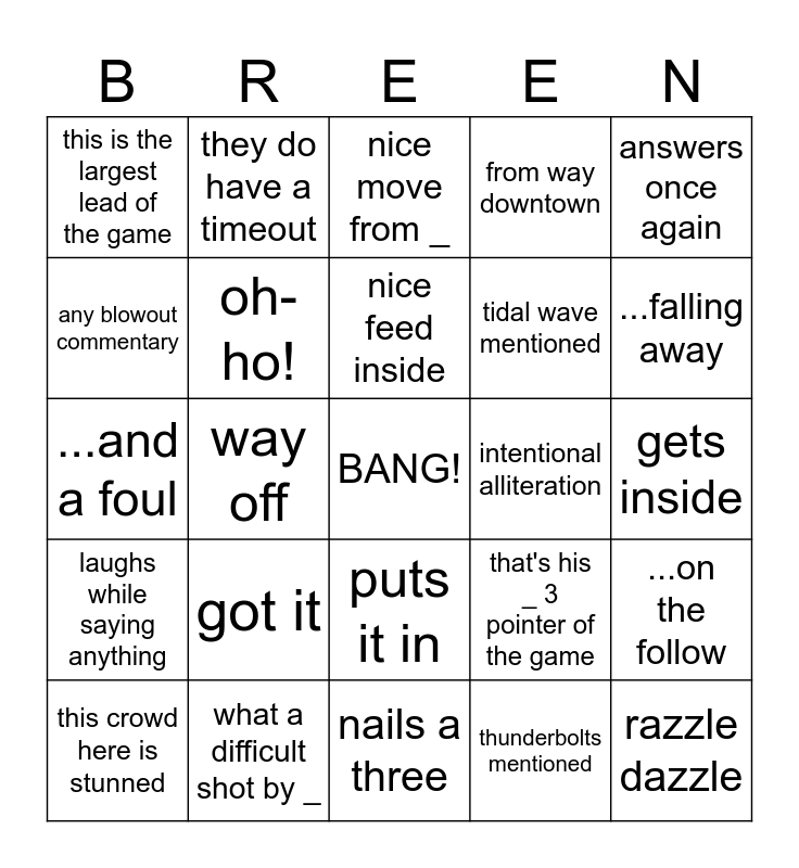 This bingo card has a free space and 24 words: got it, what a difficult shot by _, nice feed inside, this crowd here is stunned, answers once again, this is the largest lead of the game, any blowout commentary, they do have a timeout, intentional alliteration, puts it in, tidal wave mentioned, ...and a foul, that's his _ 3 pointer of the game, ...on the follow, oh-ho!, thunderbolts mentioned, gets inside, nice move from _, ...falling away, way off, razzle dazzle, laughs while saying anything, from way downtown and nails a three.