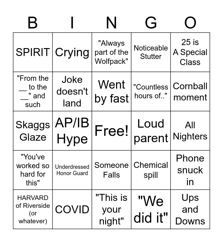 This bingo card has a free space and 24 words: Underdressed Honor Guard, COVID, Went by fast, HARVARD of Riverside (or whatever), 25 is A Special Class, SPIRIT, "From the __ to the __" and such, Crying, Loud parent, Someone Falls, "Countless hours of..", Skaggs Glaze, Chemical spill, Phone snuck in, Joke doesn't land, "We did it", All Nighters, "Always part of the Wolfpack", Cornball moment, AP/IB Hype, Ups and Downs, "You've worked so hard for this", Noticeable Stutter and "This is your night".