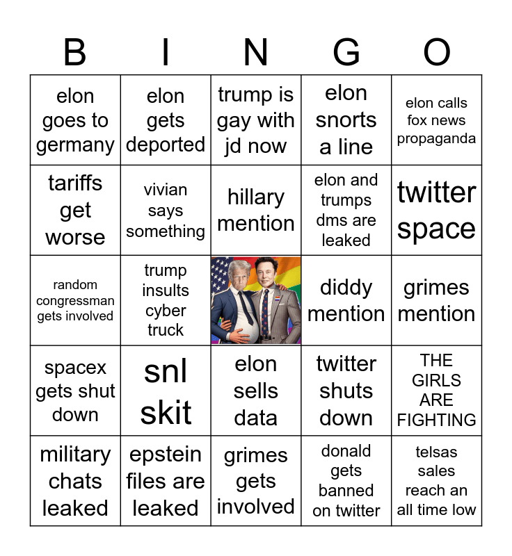 This bingo card has a free space and 24 words: snl skit, epstein files are leaked, hillary mention, military chats leaked, elon calls fox news propaganda, elon goes to germany, tariffs get worse, elon gets deported, diddy mention, elon sells data, elon and trumps dms are leaked, random congressman gets involved, twitter shuts down, THE GIRLS ARE FIGHTING, vivian says something, donald gets banned on twitter, grimes mention, trump is gay with jd now, twitter space, trump insults cyber truck, telsas sales reach an all time low, spacex gets shut down, elon snorts a line and grimes gets involved.