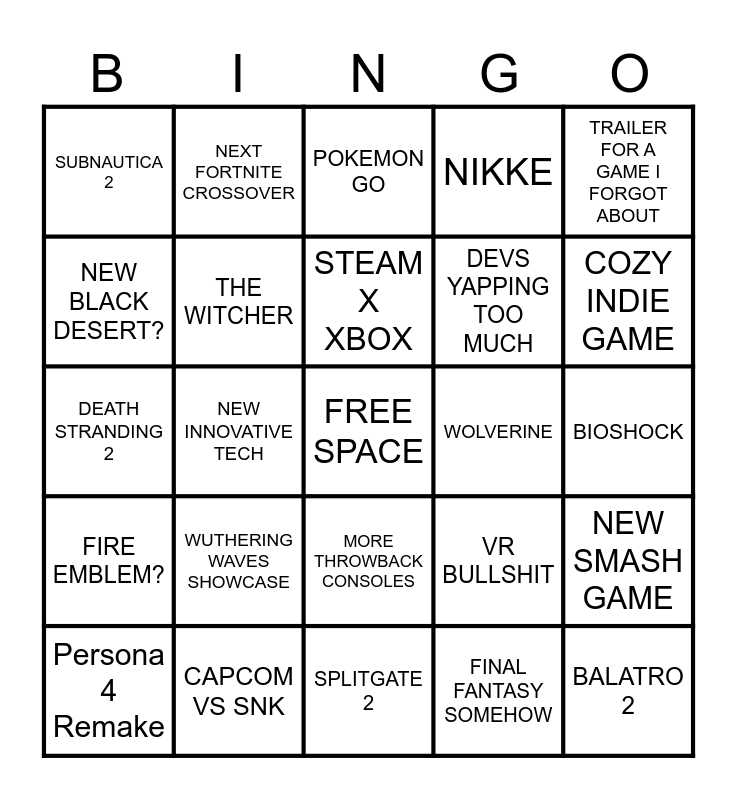 This bingo card has a free space and 24 words: Persona 4 Remake, WUTHERING WAVES SHOWCASE, STEAM X XBOX, FINAL FANTASY SOMEHOW, TRAILER FOR A GAME I FORGOT ABOUT, SUBNAUTICA 2, NEXT FORTNITE CROSSOVER, POKEMON GO, WOLVERINE, BIOSHOCK, DEATH STRANDING 2, THE WITCHER, VR BULLSHIT, NEW SMASH GAME, NEW BLACK DESERT?, CAPCOM VS SNK, SPLITGATE 2, NIKKE, COZY INDIE GAME, FIRE EMBLEM?, NEW INNOVATIVE TECH, MORE THROWBACK CONSOLES, DEVS YAPPING TOO MUCH and BALATRO 2.
