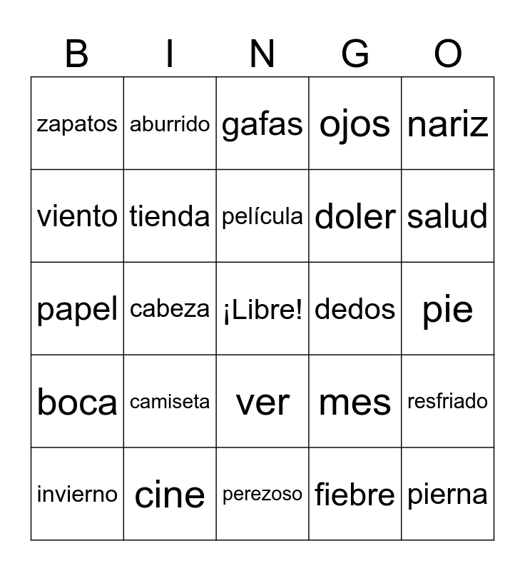 This bingo card has a free space and 40 words: carpeta, papel, biblioteca, tienda, cine, ver, película, supermercado, nariz, boca, cabeza, ojos, pierna, pie, dedos, camiseta, sudadera, zapatos, falda, gafas, resfriado, fiebre, doler, viento, sol, llover, nevar, nube, primavera, otoño, verano, invierno, semana, mes, salud, perezoso, gracioso, divertido, aburrido and mascota.