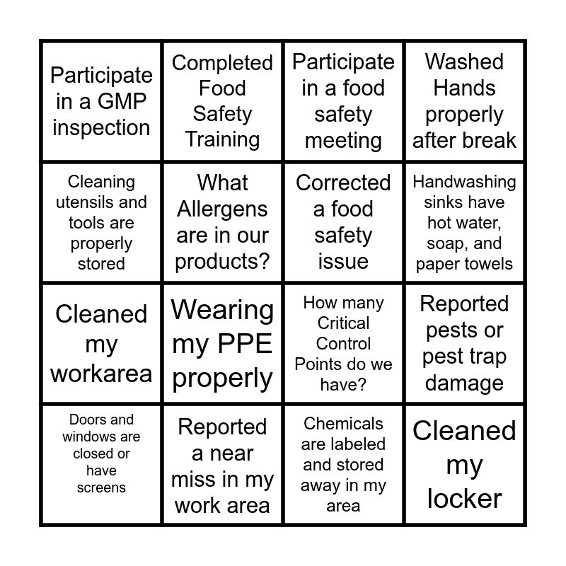 This bingo card has 16 words: Doors and windows are closed or have screens, Reported a near miss in my work area, Participate in a food safety meeting, Washed Hands properly after break, Cleaning utensils and tools are properly stored, Completed Food Safety Training, How many Critical Control Points do we have?, Reported pests or pest trap damage, Participate in a GMP inspection, What Allergens are in our products?, Chemicals are labeled and stored away in my area, Handwashing sinks have hot water, soap, and paper towels, Cleaned my workarea, Wearing my PPE properly, Corrected a food safety issue and Cleaned my locker.