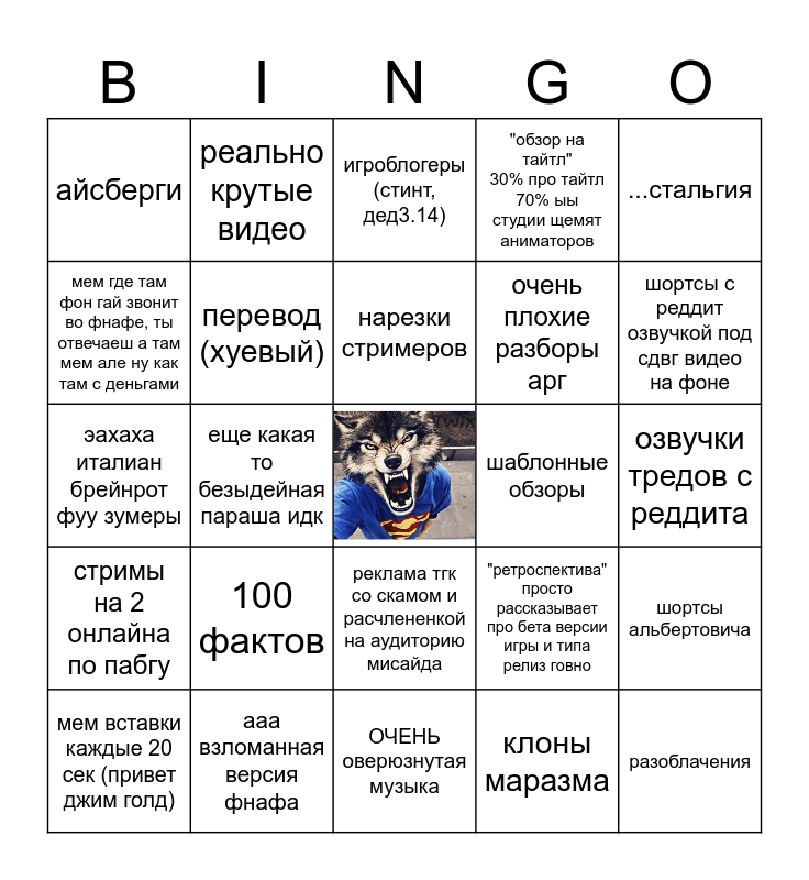 This bingo card has a free space and 24 words: 100 фактов, ааа взломанная версия фнафа, нарезки стримеров, мем вставки каждые 20 сек (привет джим голд), ...стальгия, айсберги, мем где там фон гай звонит во фнафе, ты отвечаеш а там мем але ну как там с деньгами, реально крутые видео, шаблонные обзоры, реклама тгк со скамом и расчлененкой на аудиторию мисайда, очень плохие разборы арг, эахаха италиан брейнрот фуу зумеры, "ретроспектива" просто рассказывает про бета версии игры и типа релиз говно, шортсы альбертовича, перевод (хуевый), клоны маразма, озвучки тредов с реддита, игроблогеры (стинт, дед3.14), шортсы с реддит озвучкой под сдвг видео на фоне, еще какая то безыдейная параша идк, разоблачения, стримы на 2 онлайна по пабгу, "обзор на тайтл" 30% про тайтл 70% ыы студии щемят аниматоров and ОЧЕНЬ оверюзнутая музыка.
