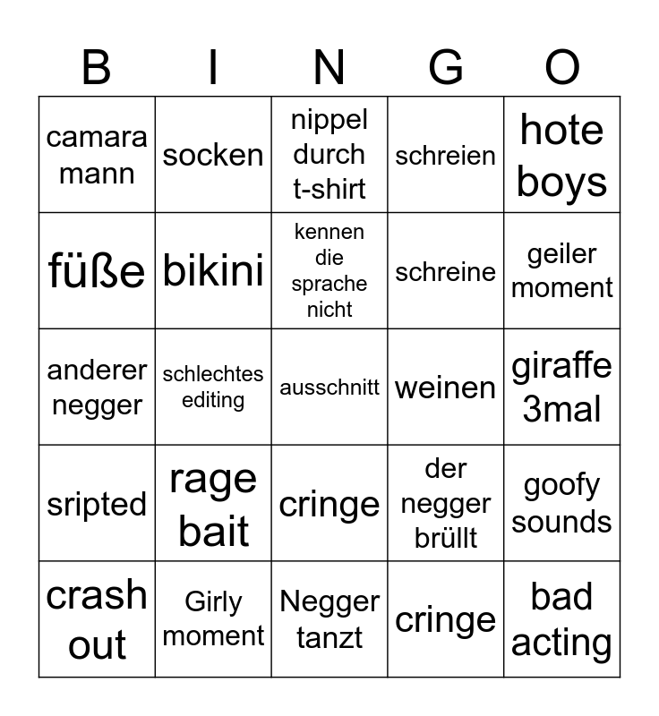 This bingo card has a free space and 24 words: rage bait, Girly moment, kennen die sprache nicht, crash out, hote boys, camara mann, füße, socken, weinen, cringe, schreine, anderer negger, der negger brüllt, goofy sounds, bikini, cringe, giraffe 3mal, nippel durch t-shirt, geiler moment, schlechtes editing, bad acting, sripted, schreien and Negger tanzt.