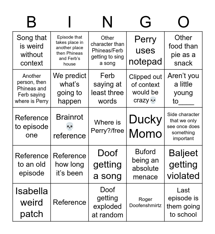 This bingo card has a free space and 24 words: Reference how long it’s been, Reference, Ferb saying at least three words, Isabella weird patch, Other food than pie as a snack, Song that is weird without context, Another person, then Phineas and Ferb saying where is Perry, Episode that takes place in another place then Phineas and Ferb’s house, Ducky Momo, Doof getting a song, Clipped out of context would be crazy💀, Reference to episode one, Buford being an absolute menace, Baljeet getting violated, We predict what’s going to happen, Roger Doofenshmirtz, Side character that we only see once does something important, Other character than Phineas/Ferb getting to sing a song, Aren’t you a little young to____, Brainrot💀reference, Last episode is them going to school, Reference to an old episode, Perry uses notepad and Doof getting exploded at random.
