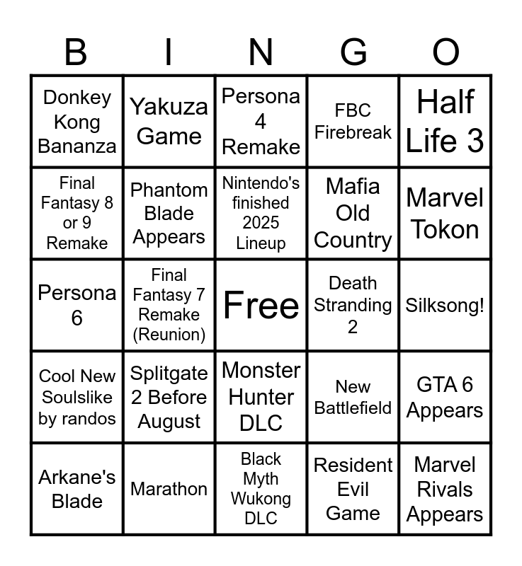 This bingo card has a free space and 24 words: Splitgate 2 Before August, Marathon, Nintendo's finished 2025 Lineup, Arkane's Blade, Half Life 3, Donkey Kong Bananza, Final Fantasy 8 or 9 Remake, Yakuza Game, Death Stranding 2, Monster Hunter DLC, Mafia Old Country, Persona 6, New Battlefield, GTA 6 Appears, Phantom Blade Appears, Resident Evil Game, Silksong!, Persona 4 Remake, Marvel Tokon, Final Fantasy 7 Remake (Reunion), Marvel Rivals Appears, Cool New Soulslike by randos, FBC Firebreak and Black Myth Wukong DLC.
