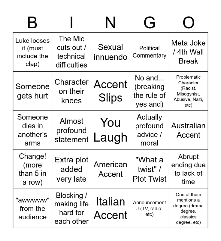 This bingo card has a free space and 104 words: Kiss, Sam's wearing a red plaid shirt, Meta Joke / 4th Wall Break, Misspoken Word, Sam correcting or pointing out a mistake, One person plays two characters at once, Short Joke, Luke Womanning, Someone gets shot, Way too attractive character, Adorable Child, Interaction with audience, Tomologue (Monologue from Tom), Name is forgotten, Bald Joke, Sam is confidently incorrect, Sexual innuendo, Random and Specific Fact, Leaving the material plane (the stage), Singing, Tall Joke, Eldritch Horror, Queer Character, Confused J (AJ is lost), Oo's Yer Dad? (secret parent revealed), Extra plot added very late, Problematic Character (Racist, Misogynist, Abusive, Nazi, etc), Political Commentary, Cheating (either in a game or in the plot), "Be Careful", "What a twist" / Plot Twist, Announcement J (TV, radio, etc), Animal, Disciplinary Meeting, Incest, Stage Craft, Someone's alone in the scene, Failing to insert themselves into the scene, Accent Slips, Blocking / making life hard for each other, Surprisingly Dark, Change! (more than 5 in a row), Creepy Character, Someone gets hurt, Laughing at their own joke, Luke looses it (must include the clap), Mishearing / Clarification, One of them mentions a degree (drama degree, classics degree, etc), Freeze Tag, Genre, Book Game, Time Warp, Party Quirks, Expert / Translator, Spiral Staircase, Irish Accent, Scottish Accent, German Accent, French Accent, American Accent, Australian Accent, Spanish Accent, AJ breaks, Tom breaks, Sam breaks, Luke breaks (badly), Call back to earlier in the show / recurring joke, The Mic cuts out / technical difficulties, Someone dies in another's arms, Almost profound statement, Italian Accent, Puppets, Pillars, Slow Motion, Amazing Captions, Shirt Unbuttoned, Someone saves another person, "awwwww" from the audience, Depressed child, Historical event mentioned, Physical (mimed) violence, Impressive sound effects, Character on their knees, Luke's part of a couple, Actually profound advice / moral, Iconic Villain, Mystery / Detective / Police, Bringing reality into it, Plot Hole, Someone loses track of the plot, Skamtebord (Very random or out of place line), Rule of three, 5+ characters, Abrupt ending due to lack of time, Rhyming, Someone ends up on the floor (faints, dies, ect), Flashback (not including time warp), No and... (breaking the rule of yes and), Snapping Necks, Perfectly tied up ending, Pulling off mask / other disguise, Use of microphone, Questionable Student / Teacher Joke (or other child / adult joke) and Villain dies.