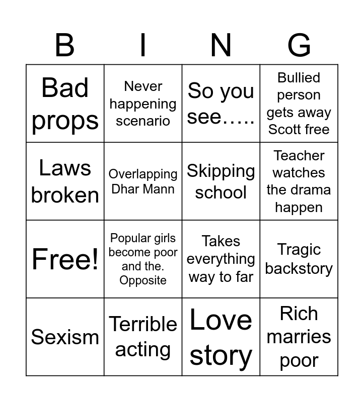 This bingo card has 20 words: Tragic backstory, Nerds, So you see….., Racist, Sexism, Laws broken, Terrible acting, Bad props, Free!, Never happening scenario, Popular girls become poor and the. Opposite, Takes everything way to far, Overlapping Dhar Mann, Rich marries poor, Skipping school, Bad songs, Teacher watches the drama happen, Bullied person gets away Scott free, Love story and Parents being the worst.