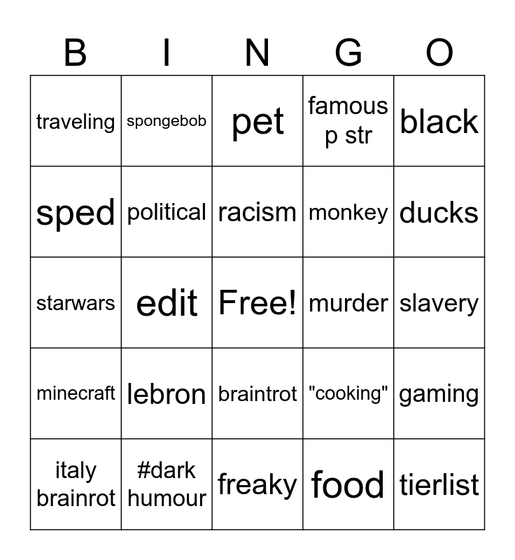 This bingo card has a free space and 24 words: lebron, #dark humour, racism, italy brainrot, black, traveling, sped, spongebob, murder, braintrot, monkey, starwars, "cooking", gaming, political, food, slavery, pet, ducks, edit, tierlist, minecraft, famous p str and freaky.