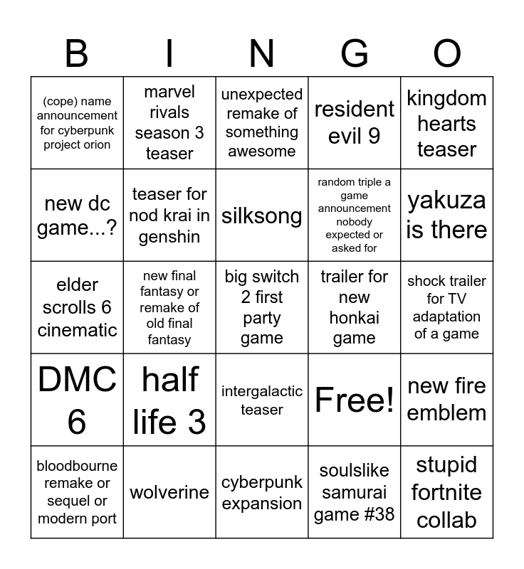 This bingo card has 25 words: half life 3, cyberpunk expansion, silksong, bloodbourne remake or sequel or modern port, kingdom hearts teaser, (cope) name announcement for cyberpunk project orion, new dc game...?, marvel rivals season 3 teaser, trailer for new honkai game, intergalactic teaser, random triple a game announcement nobody expected or asked for, elder scrolls 6 cinematic, Free!, new fire emblem, teaser for nod krai in genshin, stupid fortnite collab, shock trailer for TV adaptation of a game, unexpected remake of something awesome, yakuza is there, new final fantasy or remake of old final fantasy, big switch 2 first party game, wolverine, DMC 6, resident evil 9 and soulslike samurai game #38.