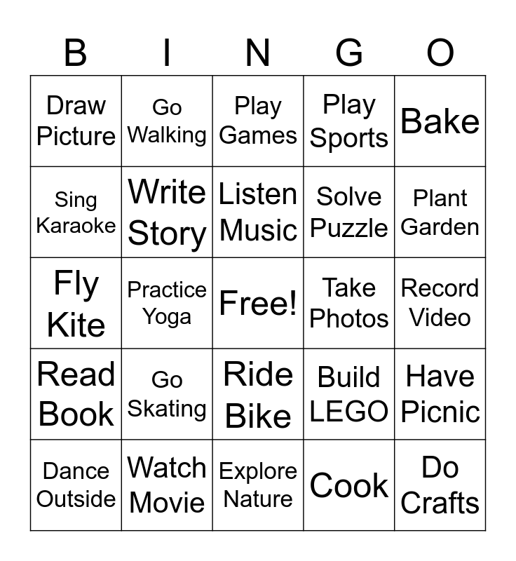 This bingo card has a free space and 26 words: Read Book, Watch Movie, Listen Music, Cook, Bake, Draw Picture, Write Story, Play Games, Solve Puzzle, Do Crafts, Sing Karaoke, Practice Yoga, Take Course, Build LEGO, Record Video, Play Instrument, Go Walking, Ride Bike, Play Sports, Have Picnic, Fly Kite, Go Skating, Explore Nature, Take Photos, Plant Garden and Dance Outside.