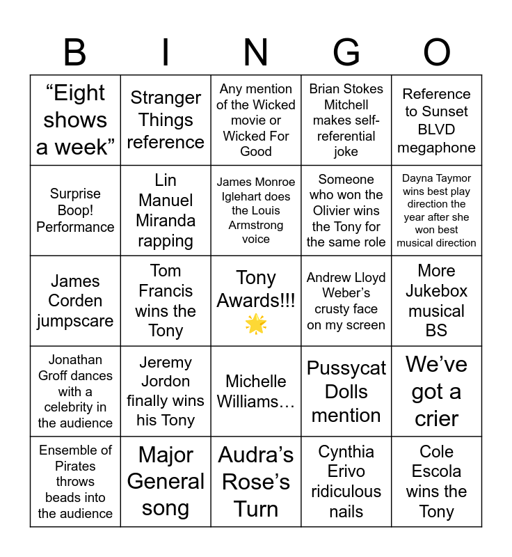 This bingo card has a free space and 24 words: Jeremy Jordon finally wins his Tony, Major General song, James Monroe Iglehart does the Louis Armstrong voice, Ensemble of Pirates throws beads into the audience, Reference to Sunset BLVD megaphone, “Eight shows a week”, Surprise Boop! Performance, Stranger Things reference, Andrew Lloyd Weber’s crusty face on my screen, Michelle Williams…, Someone who won the Olivier wins the Tony for the same role, James Corden jumpscare, Pussycat Dolls mention, We’ve got a crier, Lin Manuel Miranda rapping, Cynthia Erivo ridiculous nails, More Jukebox musical BS, Any mention of the Wicked movie or Wicked For Good, Dayna Taymor wins best play direction the year after she won best musical direction, Tom Francis wins the Tony, Cole Escola wins the Tony, Jonathan Groff dances with a celebrity in the audience, Brian Stokes Mitchell makes self-referential joke and Audra’s Rose’s Turn.
