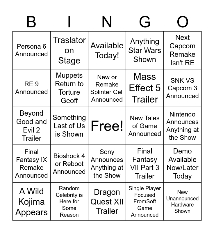 This bingo card has a free space and 24 words: Bioshock 4 or Reboot Announced, Random Celebrity is Here for Some Reason, New or Remake Splinter Cell Announced, A Wild Kojima Appears, Next Capcom Remake Isn't RE, Persona 6 Announced, RE 9 Announced, Traslator on Stage, New Tales of Game Announced, Sony Announces Anything at the Show, Mass Effect 5 Trailer, Beyond Good and Evil 2 Trailer, Final Fantasy VII Part 3 Trailer, Demo Available Now/Later Today, Muppets Return to Torture Geoff, Single Player Focused FromSoft Game Announced, Nintendo Announces Anything at the Show, Available Today!, SNK VS Capcom 3 Announced, Something Last of Us is Shown, New Unannounced Hardware Shown, Final Fantasy IX Remake Announced, Anything Star Wars Shown and Dragon Quest XII Trailer.