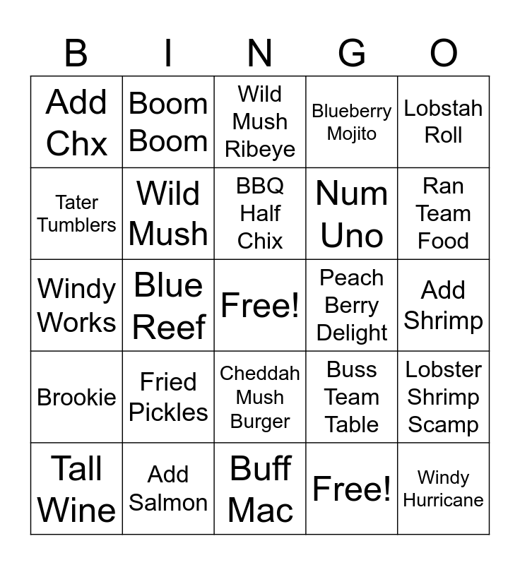 This bingo card has a free space and 32 words: Free!, Pizza Skins, Blue Reef, Roni Rollup, Brookie, Wild Mush, Lobstah Roll, Lobster Shrimp Scamp, Boom Boom, Trio Dip, BBQ Half Chix, Wild Mush Ribeye, DD Sundae Shake, Straw Short Shake, Peach Berry Delight, Straw Lem Shake, Tall Wine, Windy Works, Cheddah Mush Burger, Fried Pickles, Buss Team Table, Rattle Snake, Add Shrimp, Add Salmon, Windy Hurricane, Blueberry Mojito, Num Uno, Tater Tumblers, Add Chx, Buff Mac, Shrimp & Sirloin and Ran Team Food.