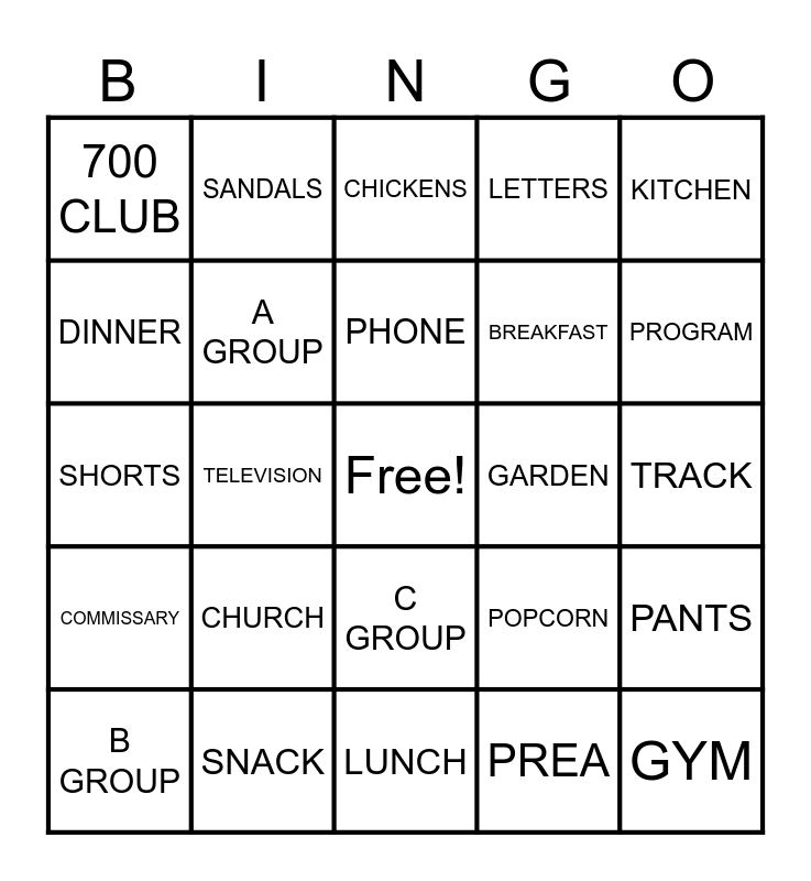 This bingo card has a free space and 39 words: DORM, BRAVO, CHARLIE, A GROUP, B GROUP, C GROUP, PHONE, COURT, KITCHEN, COMMISSARY, TELEVISION, LETTERS, GYM, TRACK, GARDEN, CHURCH, COLLEGE, 700 CLUB, MOVIE NIGHT, POPCORN, DINNER, LUNCH, BREAKFAST, PROGRAM, SECURE TRACK, VISITING, BOOKS, COMPUTER, COUCH, SANDALS, SHOES, SOCKS, CHICKENS, SNACK, PREA, SWEATER, PANTS, SHORTS and SHIRT.