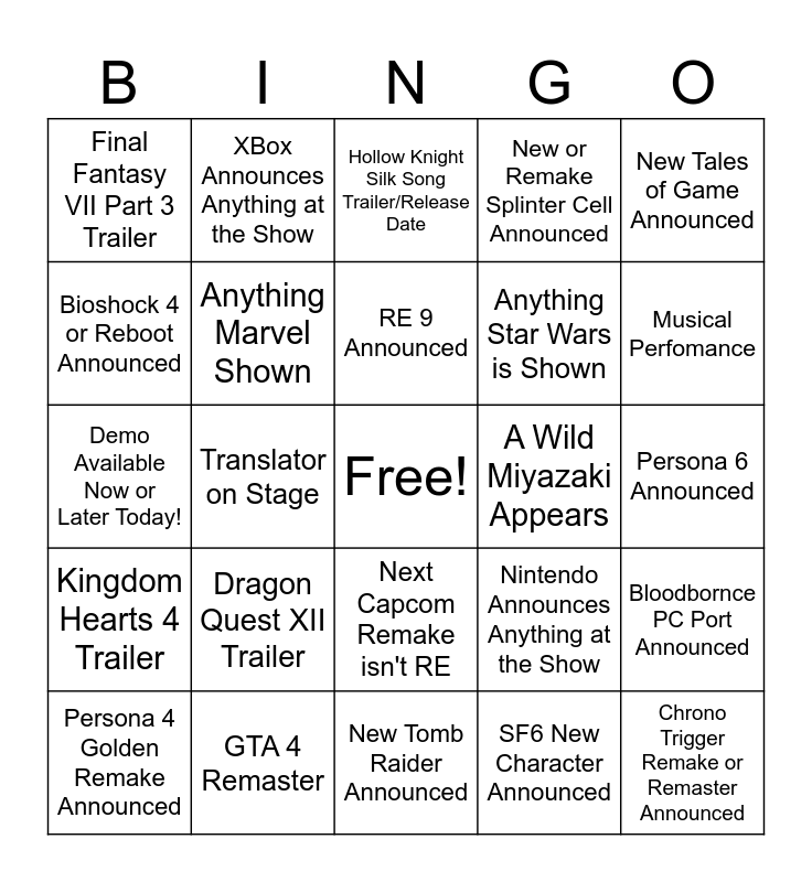 This bingo card has a free space and 24 words: Dragon Quest XII Trailer, GTA 4 Remaster, RE 9 Announced, Persona 4 Golden Remake Announced, New Tales of Game Announced, Final Fantasy VII Part 3 Trailer, Bioshock 4 or Reboot Announced, XBox Announces Anything at the Show, A Wild Miyazaki Appears, Next Capcom Remake isn't RE, Anything Star Wars is Shown, Demo Available Now or Later Today!, Nintendo Announces Anything at the Show, Bloodbornce PC Port Announced, Anything Marvel Shown, SF6 New Character Announced, Persona 6 Announced, Hollow Knight Silk Song Trailer/Release Date, Musical Perfomance, Translator on Stage, Chrono Trigger Remake or Remaster Announced, Kingdom Hearts 4 Trailer, New or Remake Splinter Cell Announced and New Tomb Raider Announced.