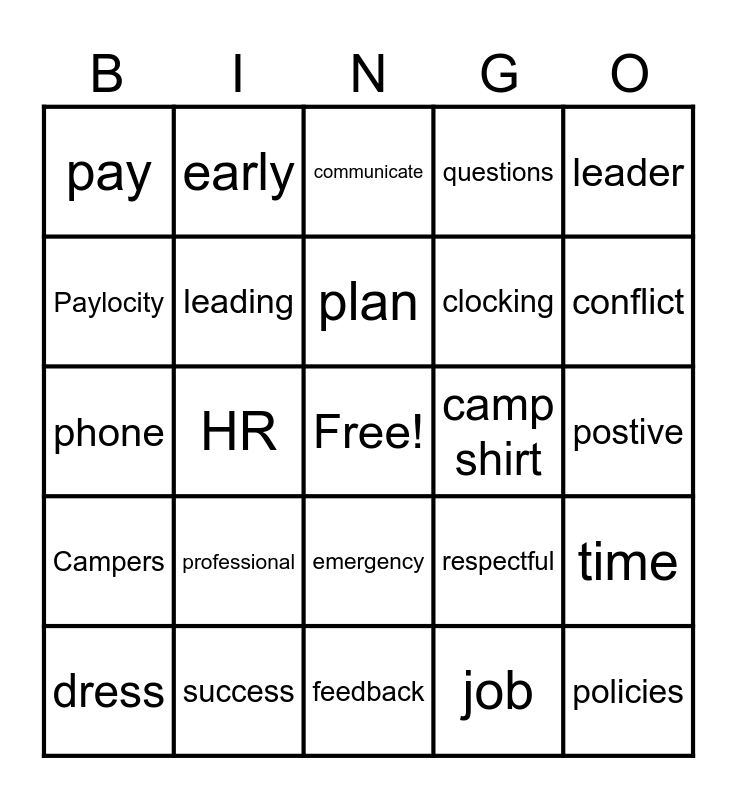 This bingo card has a free space and 32 words: job, camp, HR, Children, Campers, leading, leader, time, early, late, plan, communicate, text, expectation, camp shirt, safety, dress, phone, emergency, professional, respectful, gossip, postive, success, policies, questions, clocking, Paylocity, pay, feedback, grow and conflict.