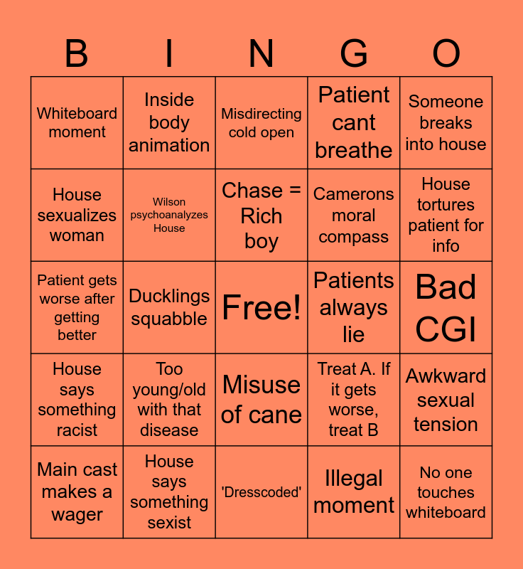 This bingo card has a free space and 62 words: House learns new skill, House says something sexist, Test rerun, House says something racist, Hilson moment, Elevator conversation, Wilson psychoanalyzes House, Unethical procedure, Camerons moral compass, Cuddy says no, Patient cant breathe, House gets clinic duty, House sexualizes woman, House storms into room, Bet money on patients, Whiteboard moment, No one touches whiteboard, Someone breaks into house, Metaphor, Chase = Rich boy, Patients always lie, Misdirecting cold open, Main cast makes a wager, Illegal moment, House sends someone to get consent, Patients hate House, Someone's having an affair, House convinced to take case, Awkward sexual tension, Heart rate spike, Entire staff checks pager, Hallucination, Downs bottle of vicodin, Patient dies, Bad CGI, Inside body animation, Acoustic cover plays, Cancer?, Ducklings squabble, Patient bleeds incorrectly, Patient gets worse after getting better, Main character in trouble, Too young/old with that disease, Break into house, House tortures patient for info, Treat A. If it gets worse, treat B, Treatment could kill, Religious allusion, House has an epiphany, House isn't main character, Misuse of cane, 'Dresscoded', Surgery is interrupted, Sleeping patient after commercial, Meeting in a new room, Doctor walk n talk, House disperses doctors, We are outside, Foreman thinks he's better, Interrupted clinic duty, Wilson gives up after House says something and Its not lupus.