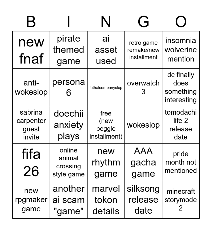 This bingo card has a free space and 24 words: online animal crossing style game, another ai scam "game", lethalcompanyslop, new rpgmaker game, insomnia wolverine mention, new fnaf, anti-wokeslop, pirate themed game, wokeslop, new rhythm game, overwatch 3, sabrina carpenter guest invite, AAA gacha game, pride month not mentioned, persona 6, silksong release date, tomodachi life 2 release date, ai asset used, dc finally does something interesting, doechii anxiety plays, minecraft storymode 2, fifa 26, retro game remake/new installment and marvel tokon details.