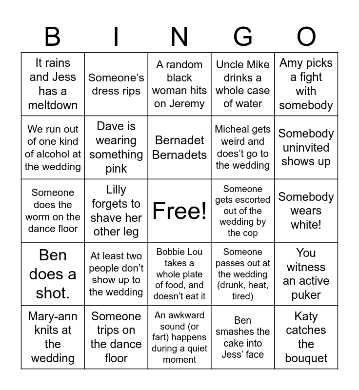 This bingo card has a free space and 24 words: At least two people don’t show up to the wedding, Someone trips on the dance floor, Bernadet Bernadets, Mary-ann knits at the wedding, Amy picks a fight with somebody, It rains and Jess has a meltdown, We run out of one kind of alcohol at the wedding, Someone’s dress rips, Someone gets escorted out of the wedding by the cop, Bobbie Lou takes a whole plate of food, and doesn’t eat it, Micheal gets weird and does’t go to the wedding, Someone does the worm on the dance floor, Someone passes out at the wedding (drunk, heat, tired), You witness an active puker, Dave is wearing something pink, Ben smashes the cake into Jess’ face, Somebody wears white!, A random black woman hits on Jeremy, Somebody uninvited shows up, Lilly forgets to shave her other leg, Katy catches the bouquet, Ben does a shot., Uncle Mike drinks a whole case of water and An awkward sound (or fart) happens during a quiet moment.