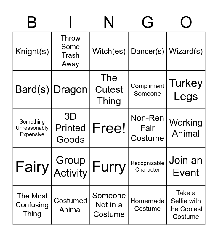 This bingo card has a free space and 30 words: Costumed Animal, Another Vendor's Card, 3D Printed Goods, "Real" Weapons, Knight(s), Witch(es), Dragon, Furry, Non-Ren Fair Costume, Someone Not in a Costume, Working Animal, Take a Selfie with the Coolest Costume, Homemade Costume, Store Bought Costume, Turkey Legs, Disney Character(s), Recognizable Character, Fairy, Group Activity, Wizard(s), Something Unreasonably Expensive, Do Something Kind, Throw Some Trash Away, Compliment Someone, Bard(s), Dancer(s), Join an Event, The Most Confusing Thing, The Cutest Thing and Sci-Fi Character.