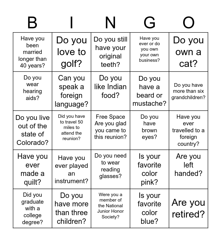 This bingo card has a free space and 24 words: Have you ever played an instrument?, Do you have more than three children?, Do you like Indian food?, Did you graduate with a college degree?, Do you own a cat?, Have you been married longer than 40 years?, Do you wear hearing aids?, Do you love to golf?, Do you have brown eyes?, Do you need to wear reading glasses?, Do you have a beard or mustache?, Do you live out of the state of Colorado?, Is your favorite color pink?, Are you left handed?, Can you speak a foreign language?, Is your favorite color blue?, Have you ever travelled to a foreign country?, Do you still have your original teeth?, Do you have more than six grandchildren?, Did you have to travel 50 miles to attend the reunion?, Are you retired?, Have you ever made a quilt?, Have you ever or do you own your own business? and Were you a member of the National Junior Honor Society?.