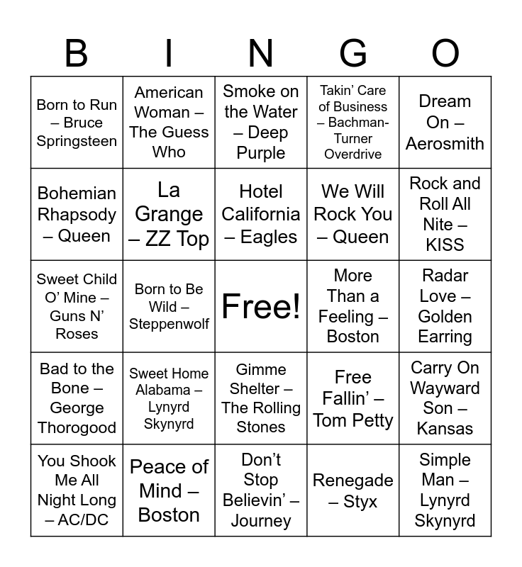 This bingo card has a free space and 25 words: Sweet Home Alabama – Lynyrd Skynyrd, Don’t Stop Believin’ – Journey, Hotel California – Eagles, You Shook Me All Night Long – AC/DC, Dream On – Aerosmith, Born to Run – Bruce Springsteen, Bohemian Rhapsody – Queen, American Woman – The Guess Who, More Than a Feeling – Boston, Gimme Shelter – The Rolling Stones, We Will Rock You – Queen, Sweet Child O’ Mine – Guns N’ Roses, Free Fallin’ – Tom Petty, Carry On Wayward Son – Kansas, La Grange – ZZ Top, Slow Ride – Foghat, Radar Love – Golden Earring, Smoke on the Water – Deep Purple, Rock and Roll All Nite – KISS, Born to Be Wild – Steppenwolf, Simple Man – Lynyrd Skynyrd, Peace of Mind – Boston, Bad to the Bone – George Thorogood, Takin’ Care of Business – Bachman-Turner Overdrive and Renegade – Styx.