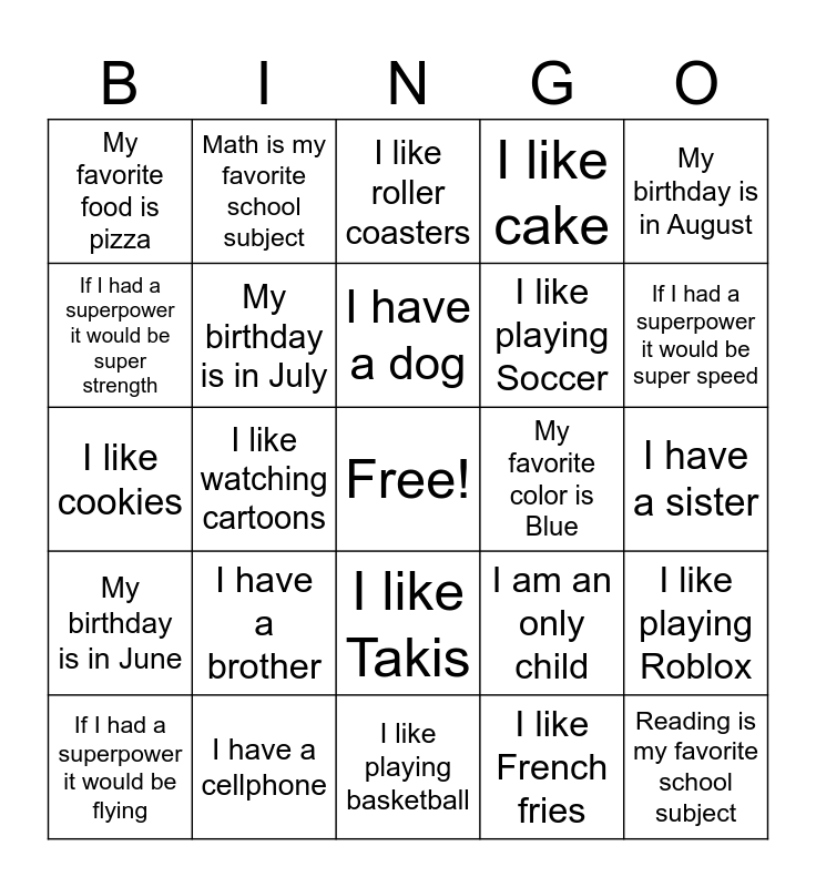 This bingo card has a free space and 24 words: I have a brother, I have a cellphone, I have a dog, If I had a superpower it would be flying, My birthday is in August, My favorite food is pizza, If I had a superpower it would be super strength, Math is my favorite school subject, My favorite color is Blue, I like Takis, I like playing Soccer, I like cookies, I am an only child, I like playing Roblox, My birthday is in July, I like French fries, I have a sister, I like roller coasters, If I had a superpower it would be super speed, I like watching cartoons, Reading is my favorite school subject, My birthday is in June, I like cake and I like playing basketball.