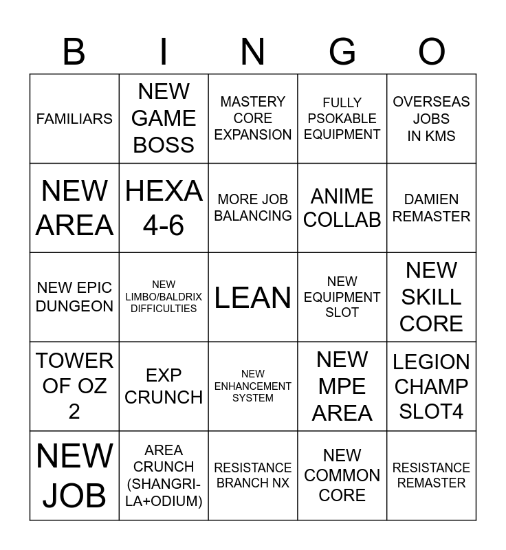 This bingo card has a free space and 24 words: EXP CRUNCH, AREA CRUNCH (SHANGRI-LA+ODIUM), MORE JOB BALANCING, NEW JOB, OVERSEAS JOBS IN KMS, FAMILIARS, NEW AREA, NEW GAME BOSS, NEW EQUIPMENT SLOT, NEW ENHANCEMENT SYSTEM, ANIME COLLAB, NEW EPIC DUNGEON, NEW MPE AREA, LEGION CHAMP SLOT4, HEXA 4-6, NEW COMMON CORE, NEW SKILL CORE, MASTERY CORE EXPANSION, DAMIEN REMASTER, NEW LIMBO/BALDRIX DIFFICULTIES, RESISTANCE REMASTER, TOWER OF OZ 2, FULLY PSOKABLE EQUIPMENT and RESISTANCE BRANCH NX.